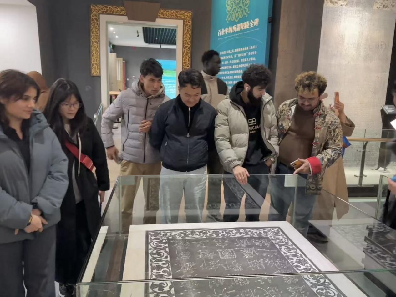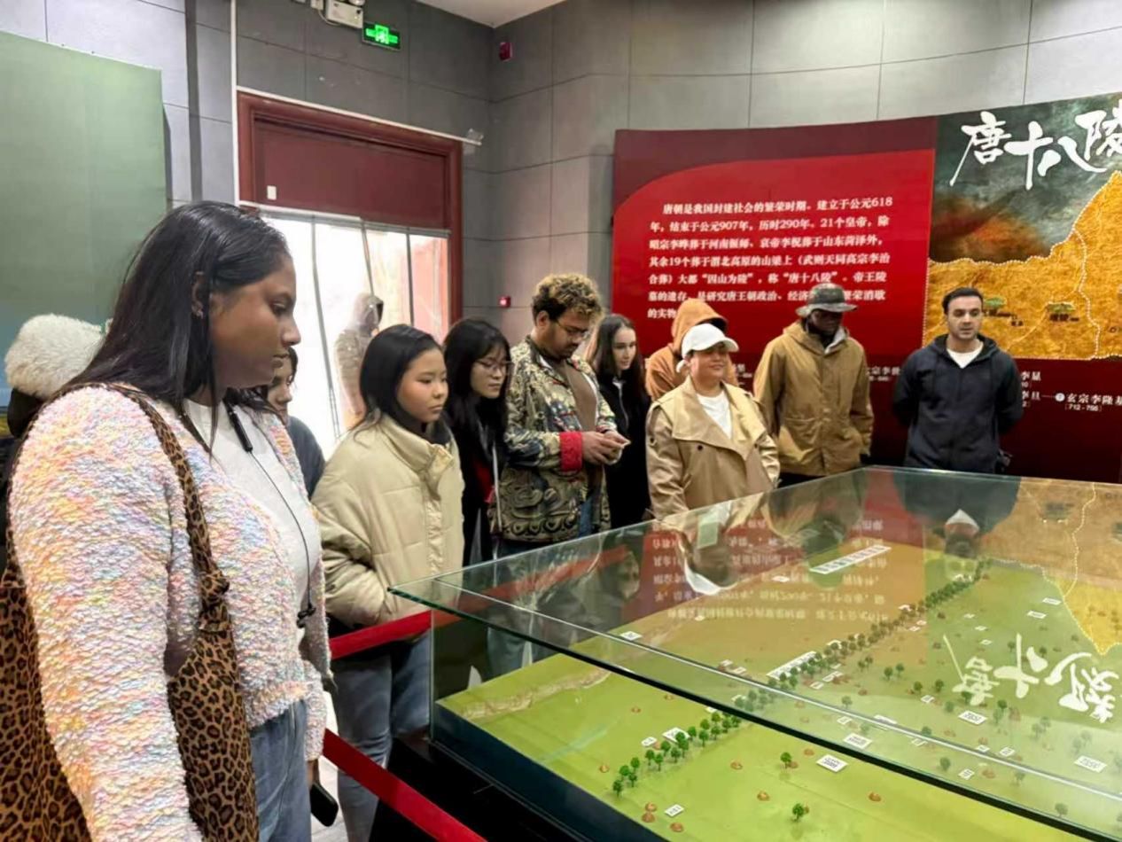 当日下午,实践团队前往陕西省咸阳市礼泉县昭陵博物馆,开启文化研学之旅。国际学生在工作人员引导下,先后参观昭陵文物精华展、昭陵碑林,欣赏昭陵唐墓壁画。通过聆听专业讲解与近距离观赏文物,学生们将抽象的“盛唐”概念具象化,深刻感受唐代与各国、各民族友好交往、交流、交融的历史场景,直观体会中华文化的厚重底蕴。