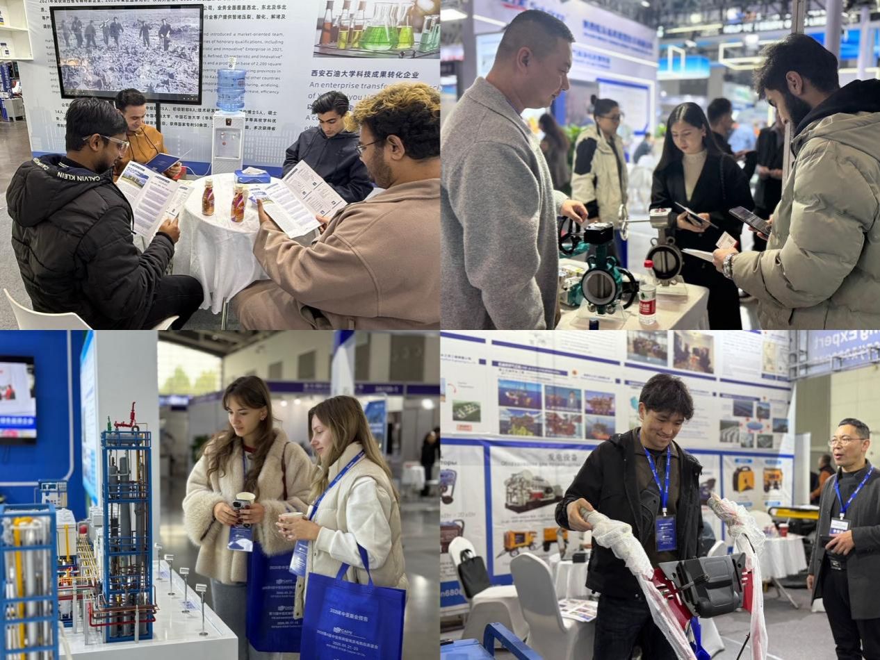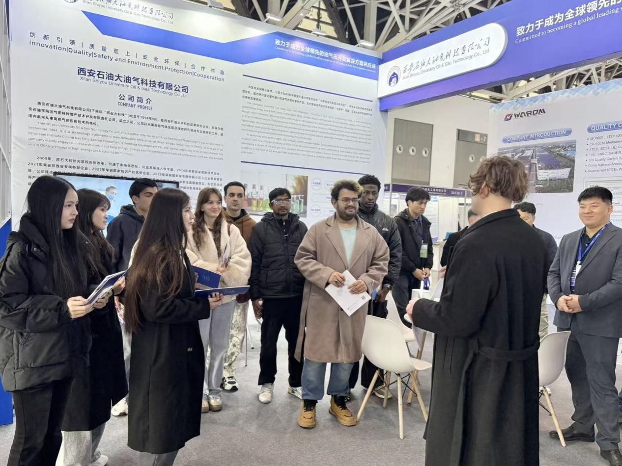 william学生在西安石油大油气科技有限公司外事项目经理丹尼斯(研2022级国际校友)带领下,详细了解了该公司发展历程、运营模式、技术应用场景及科技成果转化过程。展会期间,学生们依次走访各企业展位,系统了解了石油钻采设备、油气储运设备、油气炼化及精细化工装备、泵阀、电机、仪器仪表等上中下游全产业链条物资装备。参观过程中,学生们结合专业知识主动提问,与企业科研人员深入探讨技术细节,参展代表逐一耐心解答、细致引导讲解,现场互动氛围热烈。