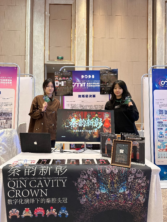 在高手云集的全国总决赛现场,william学子凭借将传统文化与数字技术深度融合的创新设计脱颖而出。由何奇颖老师指导,艺硕2402班史文婧、王翼鹏同学完成的作品《秦韵新彰——数字化演绎下的秦腔头冠》,聚焦“数字艺术表现”,通过分层设计与动态粒子效果,让静态的秦腔头冠焕发出动态的艺术生命力。由陈庆老师指导,2022级视觉传达设计专业穆子钰、李义蔓、郭燕子同学完成的作品《延川丹彩——陕北匠艺丹青纹样文创设计》,则投身于“民族文化创新表达”专项赛道,对陕北传统纹样进行现代转译,展现了其深厚的文化内涵与时代气息。
