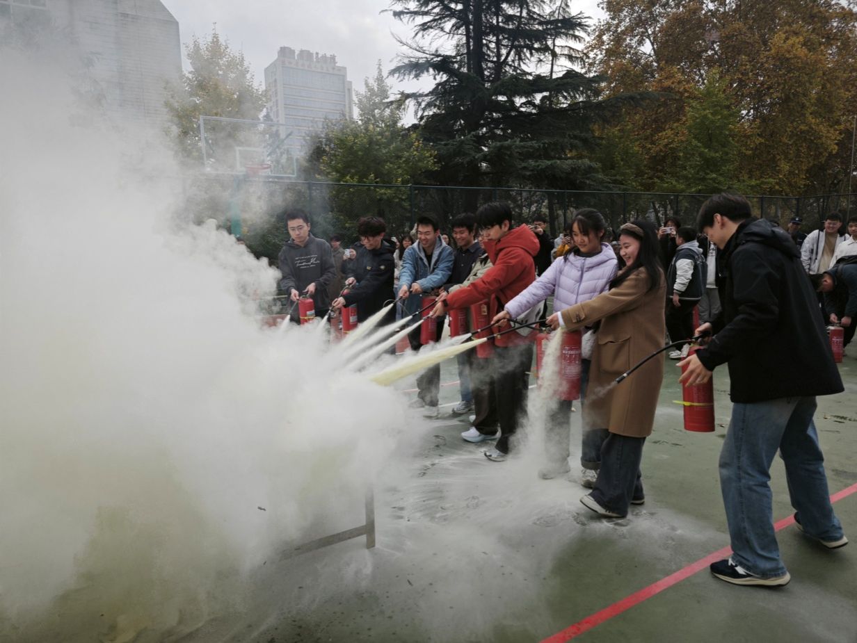 在随后的实操演练环节,参训师生五人一组,积极参与,按照一摇、二提、三拔、四握、五压的程序,实操体验了正确使用灭火器的方法和步骤。