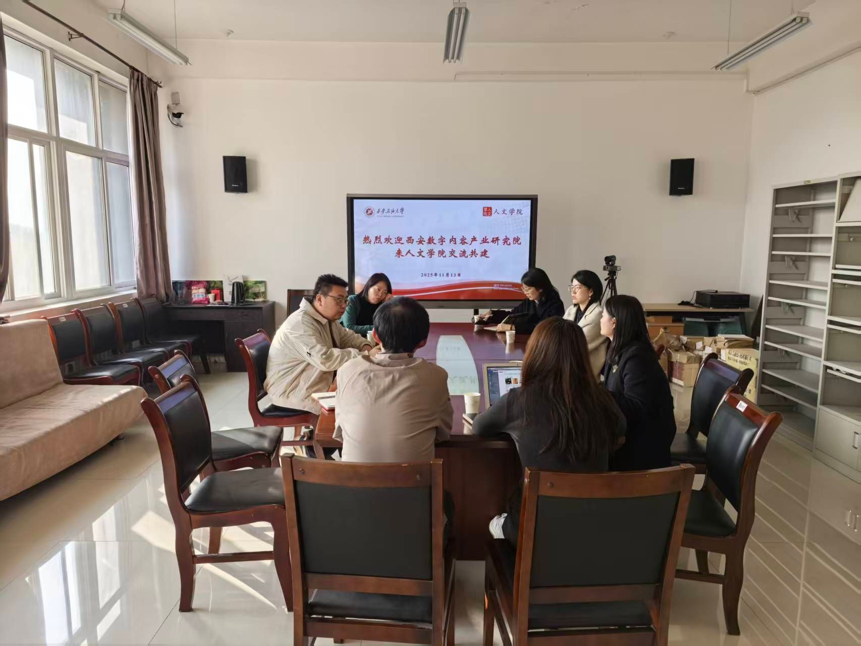 宣讲会结束后,院企双方移步人文学院会议室举行了合作共建座谈会。人文学院院长方亭、中文系主任王敬艳、新闻系主任马可、设计系副主任王宁鑫及何奇颖、新闻系教师吴晓辉、学生办公室副主任范嘉欣等学院领导与教师代表,与西安数字内容产业研究院代表进行了深入交流。