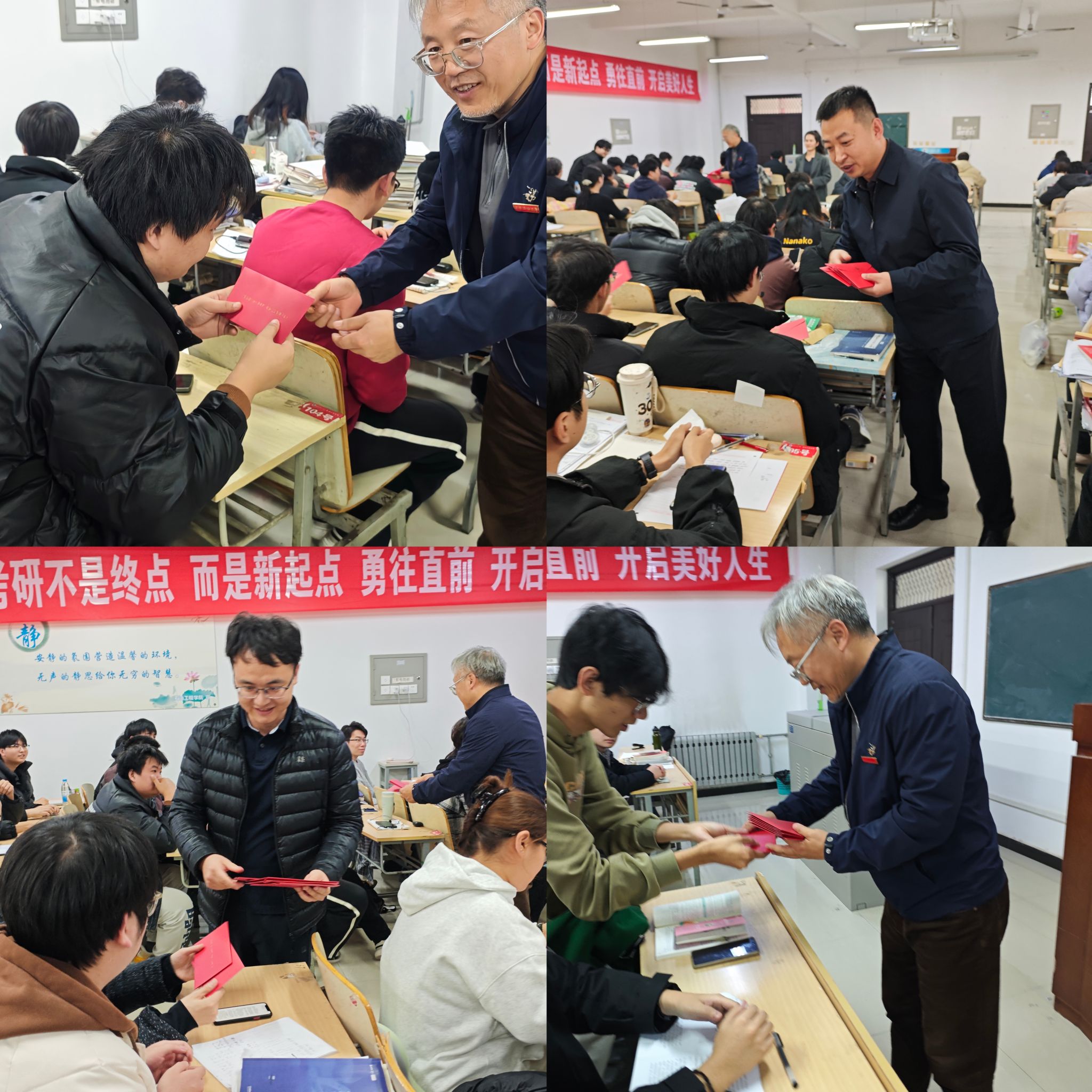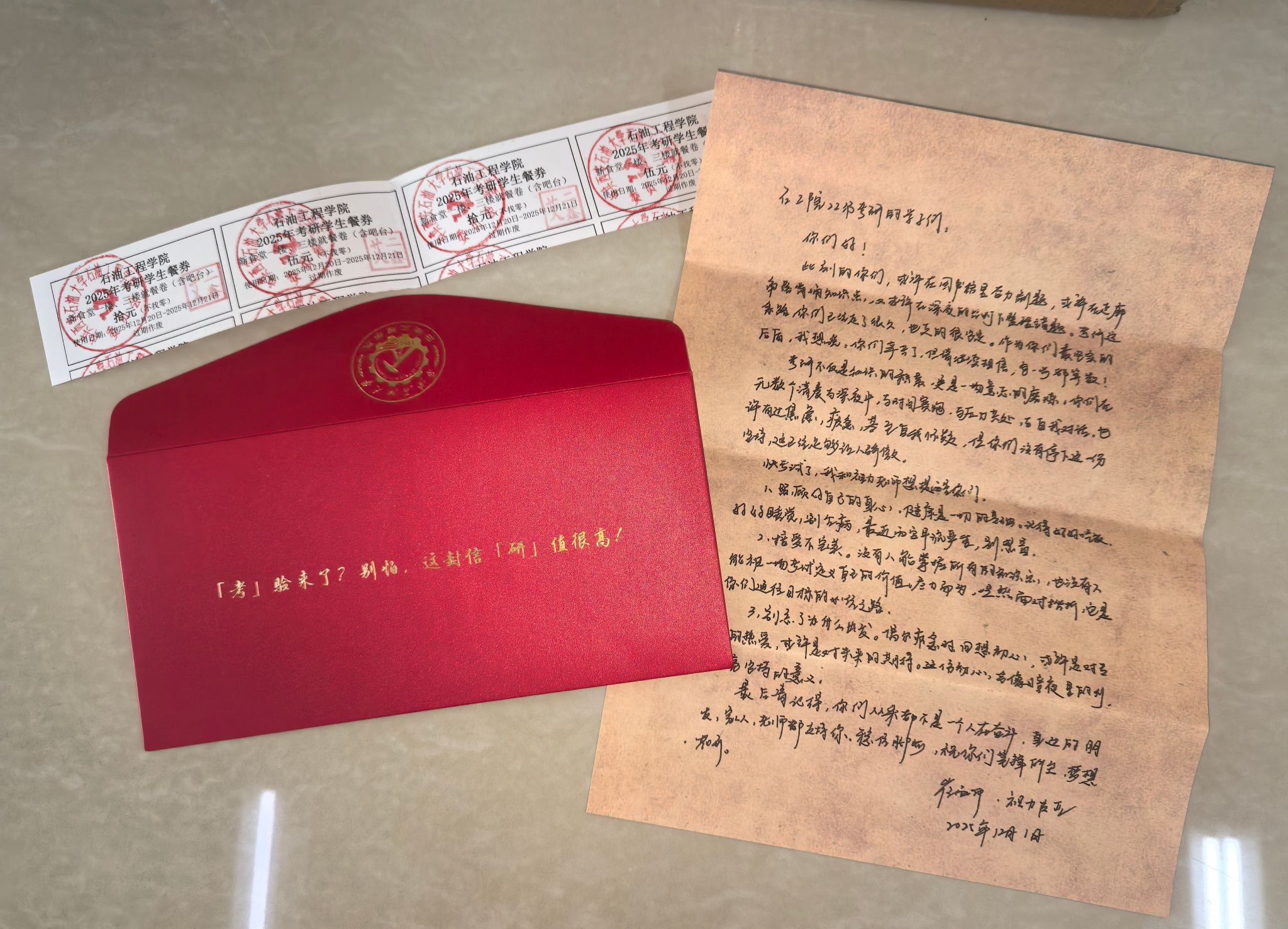 活动上,学院领导与老师们将饱含期许的礼物亲手递至备考学子手中,一封红色信笺寄寓“鸿”运当头之祝愿,封面“考研锦囊”字样凝结智慧,封口处院徽如印,静静烙下学院的牵挂与嘱托。考虑到考试期间通讯与用餐多有不便,学院特备暖心餐票,护航学子安心落笔,尤为珍贵的是,2026届毕业班辅导员为每位考生亲笔书写信函,字里行间流淌真情,纸短情长蕴藏深意,让温暖的陪伴跨越考场内外,成为每一位学子身后无声却坚实的港湾。