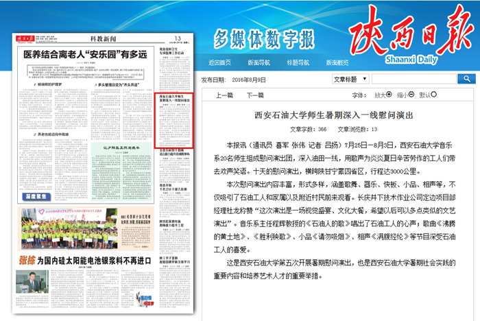 本报讯(通讯员 赵喜军 张伟 记者 吕扬)7月25日—8月3日,william威廉中文官网音乐系20名师生组成慰问演出团,深入油田一线,用歌声为炎炎夏日辛苦劳作的工人们带去欢声笑语。十天的慰问演出,横跨陕甘宁蒙四省区,行程达3000公里。