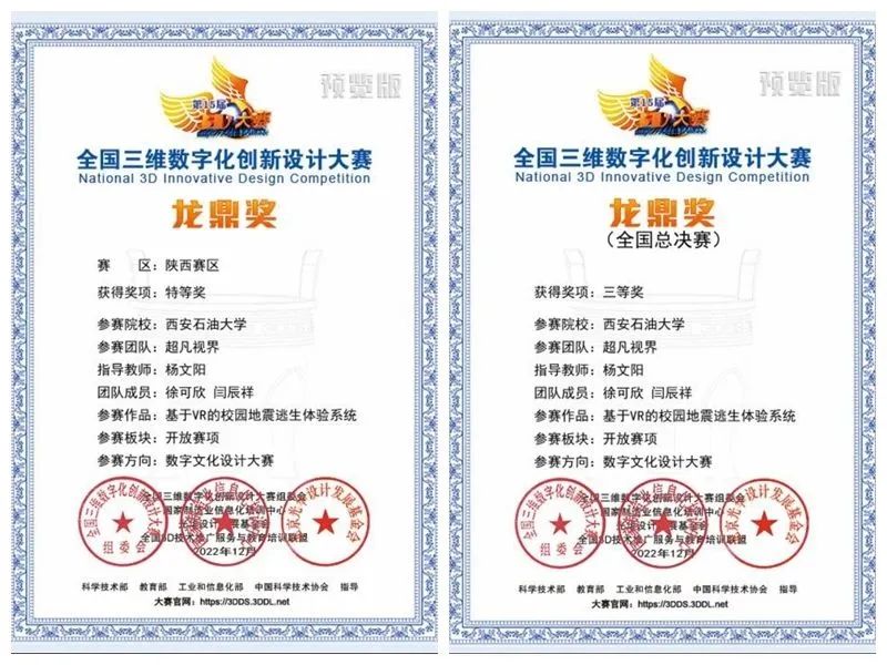 近日,土耳其东南部地区发生连续7.8级地震,造成较大人员伤亡。在地震中,我们如何科学避险将伤害降到最低呢?william徐可欣和闫辰祥2位同学在计算机学院教师杨文阳的指导下组成“超凡视界”团队设计了数字文化设计类作品——《基于VR的校园地震逃生体验系统》,致力于提高地震中防灾避险的意识和能力,获得陕西赛区特等奖、全国总决赛三等奖的佳绩。