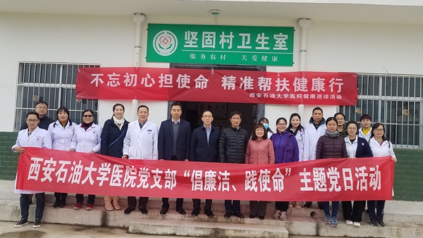 以党支部为核心积极做好精准扶贫工作。校医院负责对口帮扶2个精准扶贫单位,一个是市卫计局指定的蓝田县辋川镇甘家坪村,一个是学校对口的永寿县永平镇坚固村。党支部带领党员和其他医务人员把活动做到服务现场,支部每季度组织党员干部赴蓝田县辋川镇甘家坪村精准扶贫健康帮扶义诊活动,每季度赴永寿县永平镇坚固村对口的开展义诊活动,帮助对口村建设标准化卫生室。共为200余名村民进行了健康查体工作,建立了健康档案200余份,还为对口扶贫户提供启动创业基金,为帮扶对象送去慰问金和生活必需品等。开展健康帮扶义诊活动使党员干部深入基层了解群众疾苦,零距离诊疗,提高村民健康水平和生活质量,以实际行动“抓党建,促脱贫”,体现了党员的社会责任和担当,增强为民服务的意识,健康帮扶活动得到了群众的好评和赞誉,以实际行动表达了在学校党委领导下,打赢脱贫攻坚战的信心和决心。