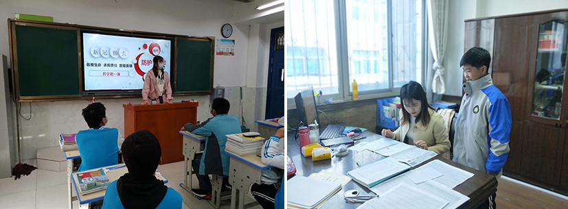在工作期间,多名研支团成员还兼任学校部分科室行政工作。支教团成员基于所在服务学校的工作安排,充分发挥自己所学,完成教育教学任务和各项行政工作。同时,通过人文关注、友伴关怀等方式帮助服务地学生树立成才报国的远大理想,以人格影响人格、用心灵塑造心灵,践行研支团初心,为服务地的教育事业和社会发展注入新鲜活力,让青春之花绽放在祖国最需要的地方。