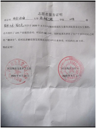 5月份,在不耽误学校的网络课程的同时,阿米乃木•阿巴克利用课下时间去当地的村委会帮忙,担任村民委员会党建办协管员,准备党课资料,整理党员档案,录入智慧党建系统等工作。在村委会帮忙的这段日子里,她深深的被身边各行各业优秀的党员事迹感动着,为了积极向党组织靠拢,她明确表示回校后将向学院递交自己的第一份入党申请书。