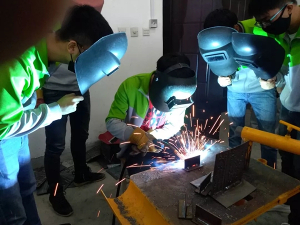 弯着腰,汗流浃背,迎着刺眼的焊花,实操课的老师们就是这样兢兢业业地陪着同学们经历无数次的焊接的学习、研究和练习,最终让同学们达到了优秀的“电焊工”水平。