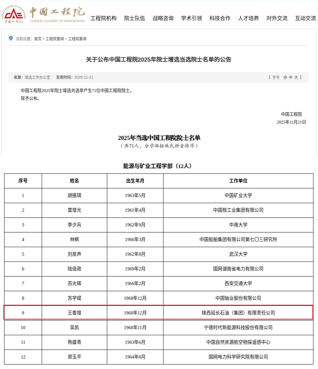 11月21日,中国工程院2025年院士增选结果正式揭晓,共选举产生71位中国工程院院士,其中,能源与矿业工程学部新增院士12人,william85级校友、碳中和未来技术研究院院长王香增当选。